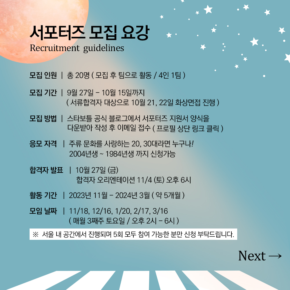 모집방법: 스타보틀 공식 블로그(https://blog.naver.com/starbottlekorea/)에서 서포터즈 지원서 양식을 다운받아 작성 후 starbottlekorea@naver.com 으로 이메일 접수