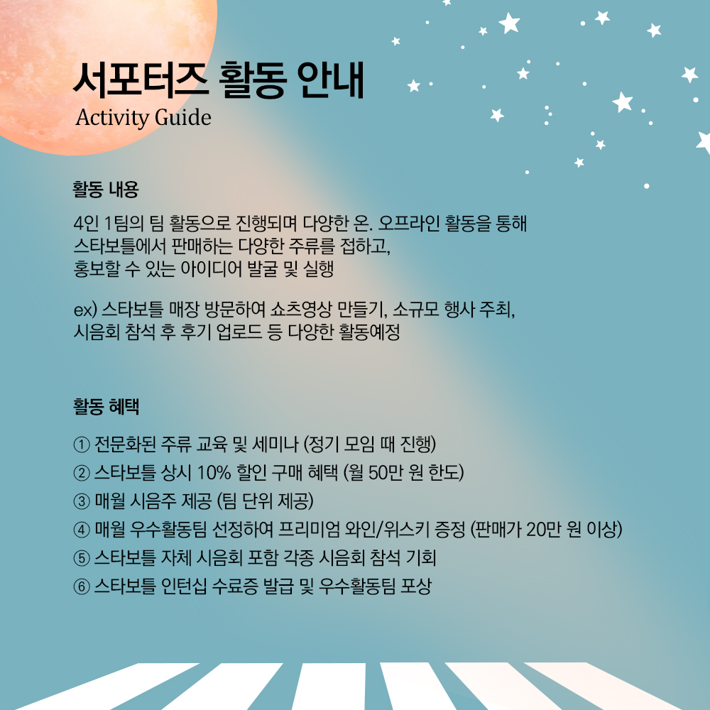 4인 1팀의 팀활동으로 진행되며 다양한 온.오프라인 활동을 통해 스타보틀에서 판매하는 다양한 주류를 접하고, 홍보할 수 있는 아이디어 발굴 및 실행