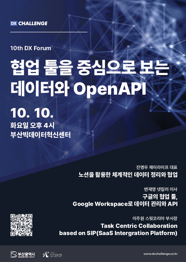 부산광역시와 부산테크노파크가 주최, 주관하는 DX Challenge에서 10th DX Forum: ‘협업 툴을 중심으로 보는 데이터와 OpenAPI’을 개최합니다. 🙌🏻이번 포럼에서는 다양한 분야의 전문가분들을 모시고 협업툴 활용과 OpenAPI 활용 사례를 알아보며 새로운 인사이트를 나누는 시간을 가질 예정이예요.