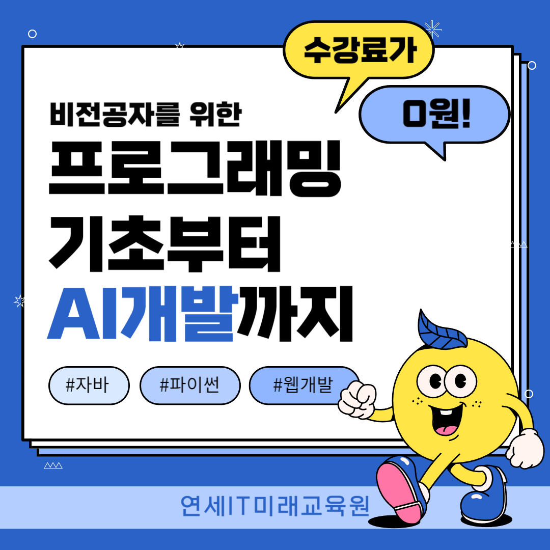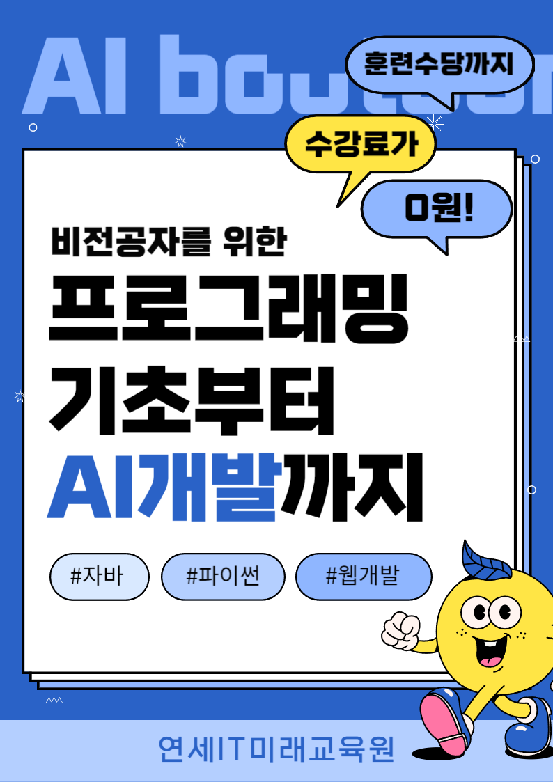 #자바 #파이썬 #딥러닝 #R프로그래밍 #개발자부트캠프 #웹개발취업캠프 #AI부트캠프 #국비지원 #코딩부트캠프 #국비지원컴퓨터학원 #코딩국비지원 #소프트웨어 #IT국비지원 #프로그래밍 #IT학원 #취업정보 #내일배움카드 #인공지능 #SQL #데이터베이스 #GPT #머신러닝 #AI학원 #JAVA강의