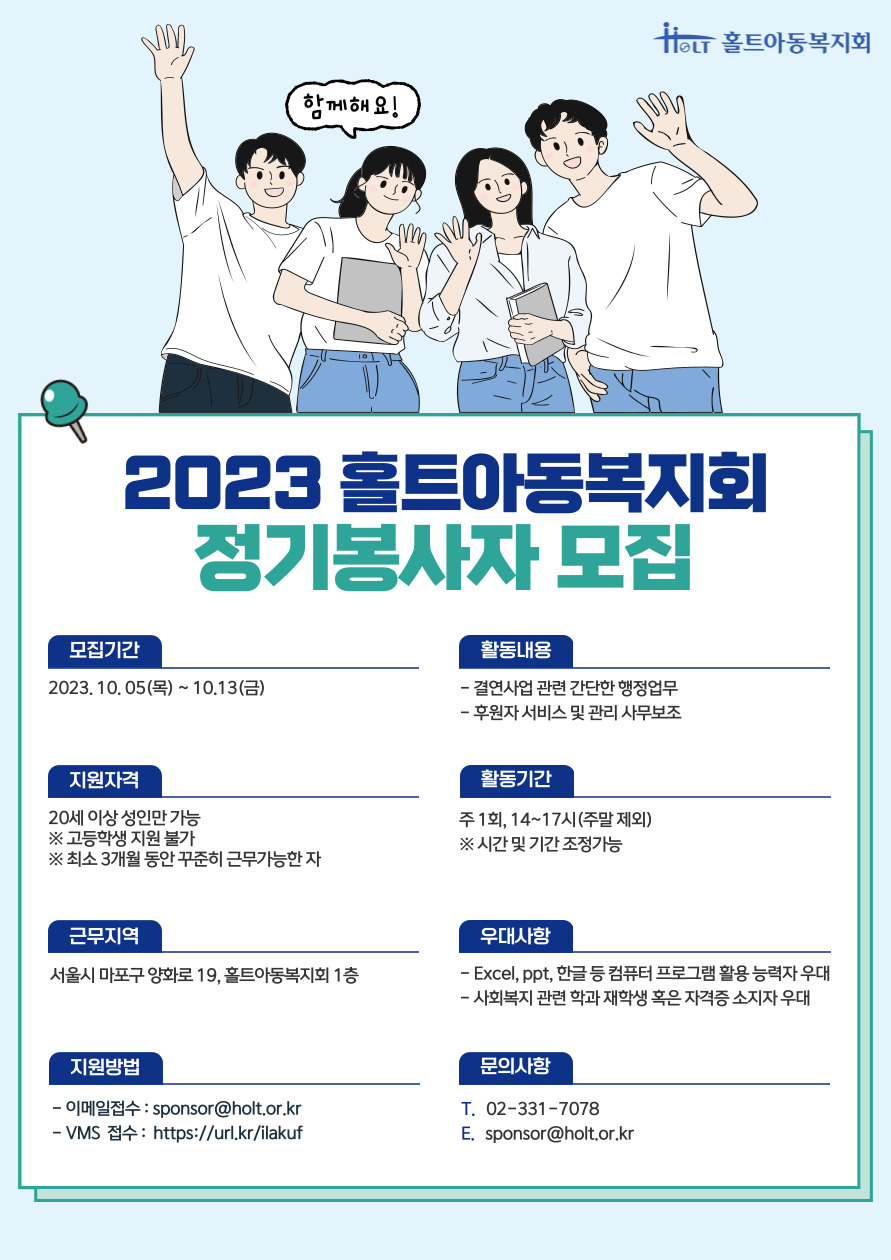 - 근무지 : 서울시 마포구 양화로 19, 홀트아동복지회 (합정역 8번출구)