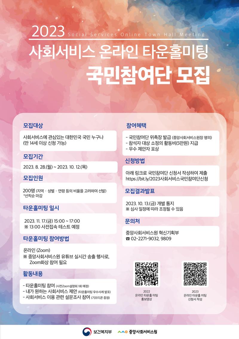 중앙사회서비스원에서 「2023년 사회서비스 온라인 타운홀미팅」 국민참여단을 모집합니다.