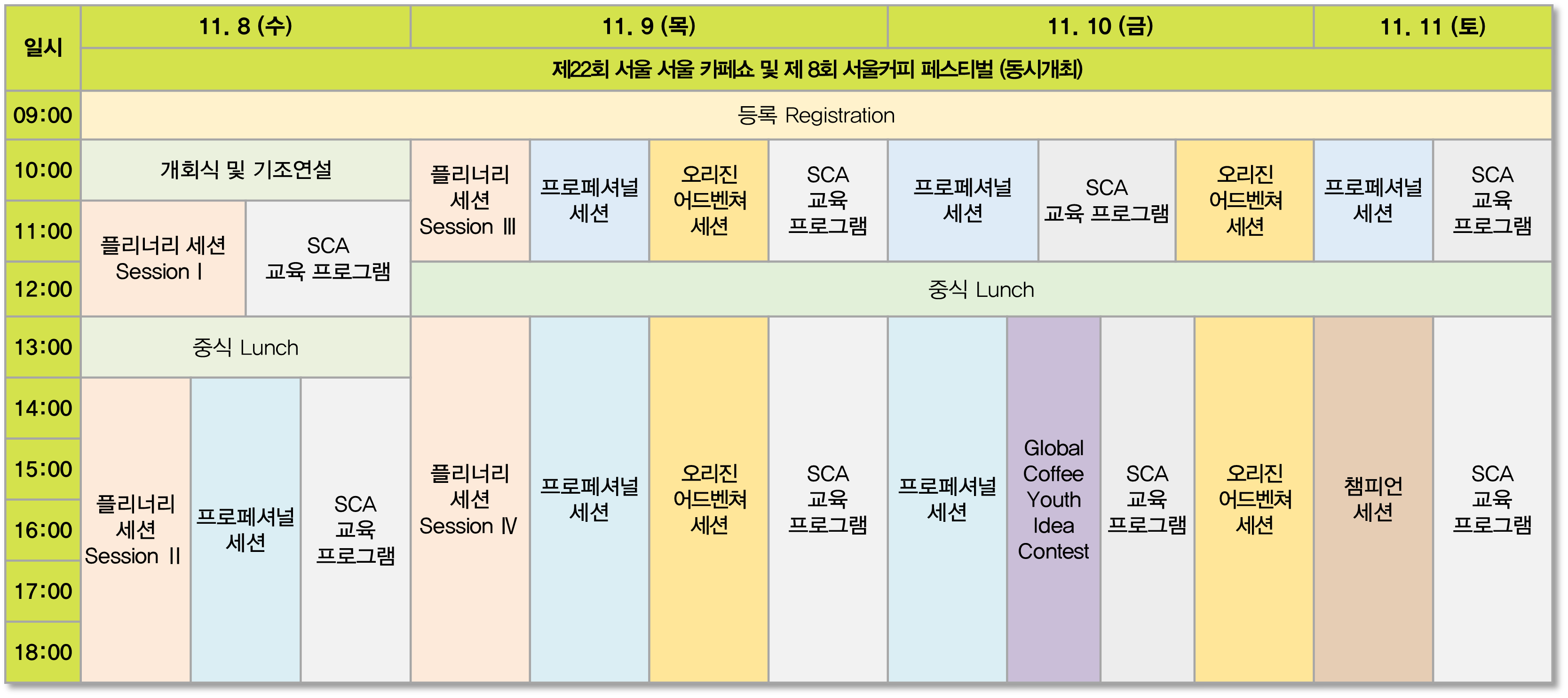 - 주요프로그램 : 플리너리 세션, 프로페셔널 세션, 오리진어드벤쳐 세션, Global Youth Idea Contest, 챔피언세션, 월드커피 K-디저트 페어링 SCA 교육 프로그램 등