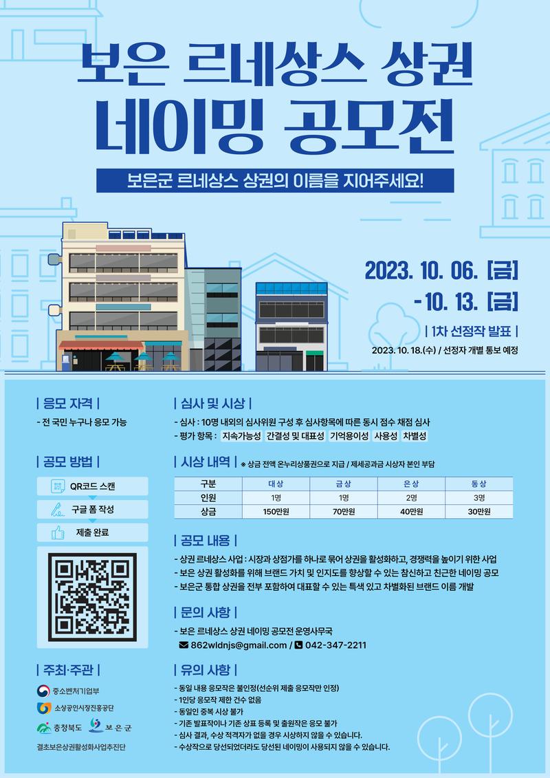 보은 상권활성화를 위해 브랜드 가치 및 인지도를 향상할 수 있는 참신하고 친근한 네이밍 공모.