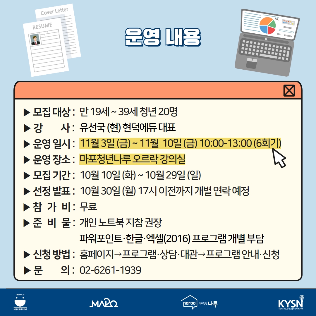 ▶일시: 11.03.(금)~11.10.(금) 10:00-13:00 (6회기)