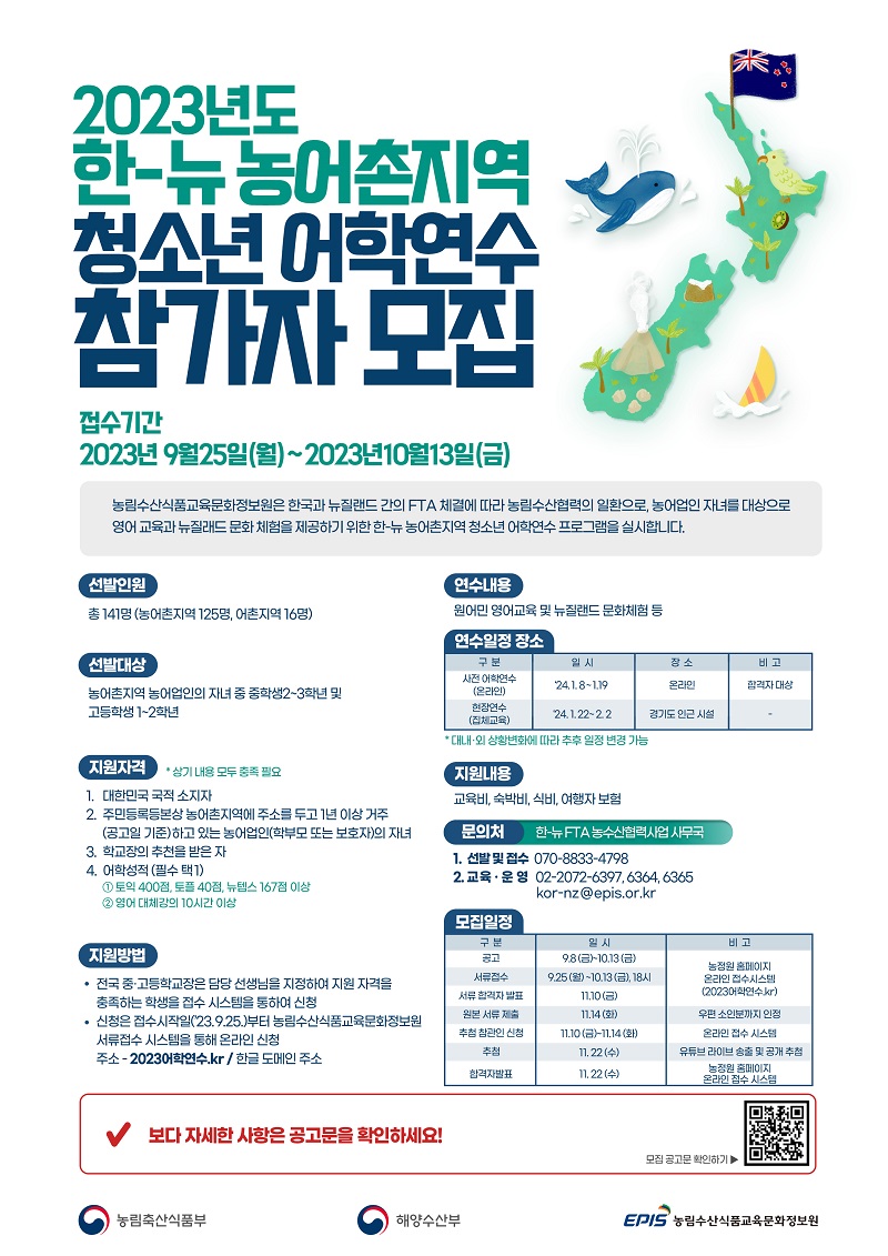 2023년도 한-뉴 농어촌지역 청소년 어학연수 참가자 모집
