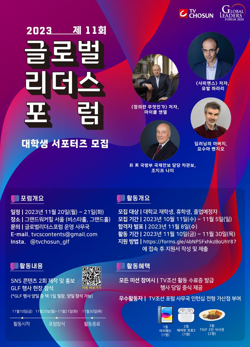 💡 TV조선이 주최하는 2023 글로벌리더스포럼 현장에 직접 방문하고 홍보 콘텐츠를 제작할 "대학생 서포터즈"를 모집합니다 💡