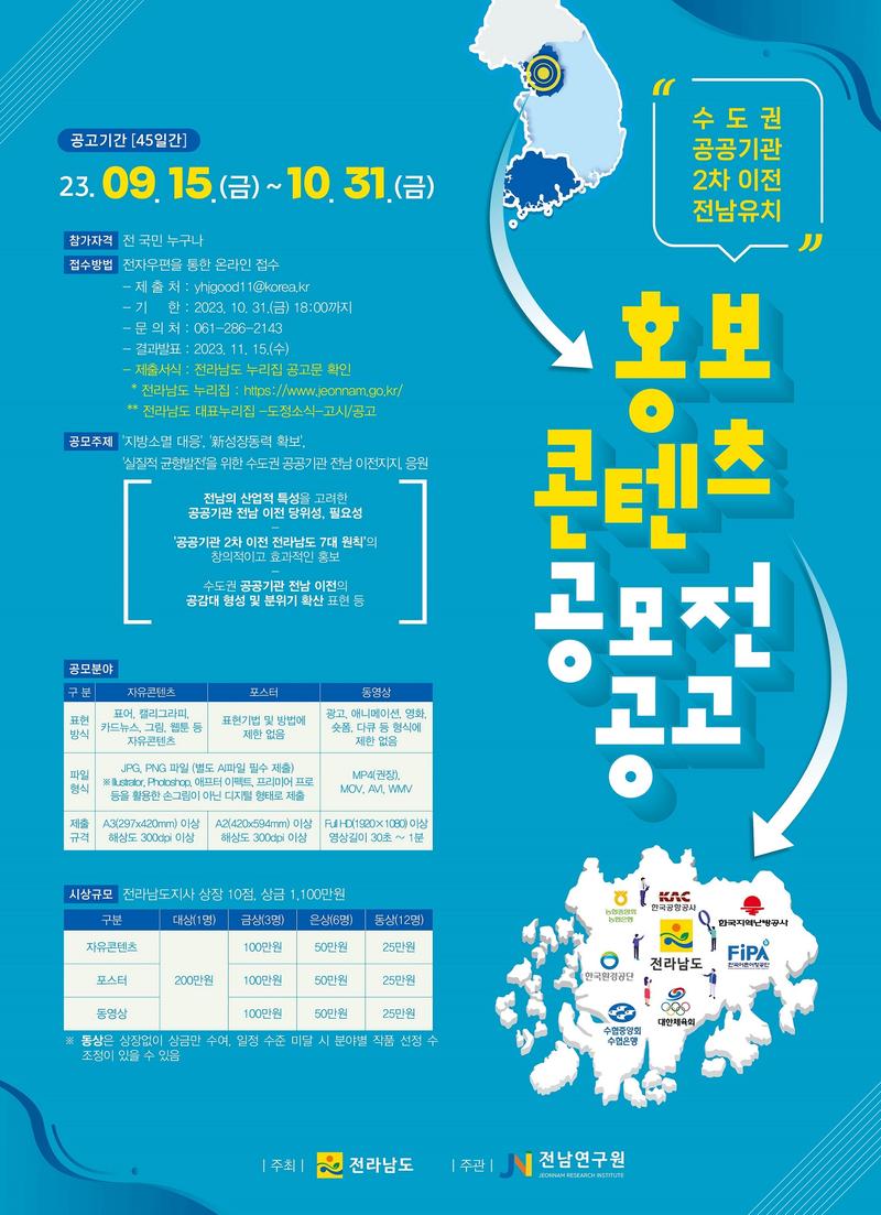 전라남도는 지방소멸위기 대응 및 국가균형발전을 위한 ‘수도권 공공기관 2차 이전’ 전남 유치 홍보 콘텐츠 공모전을 다음과 같이 공고하오니 관심 있는 분께서는 참여하여 주시기 바랍니다.