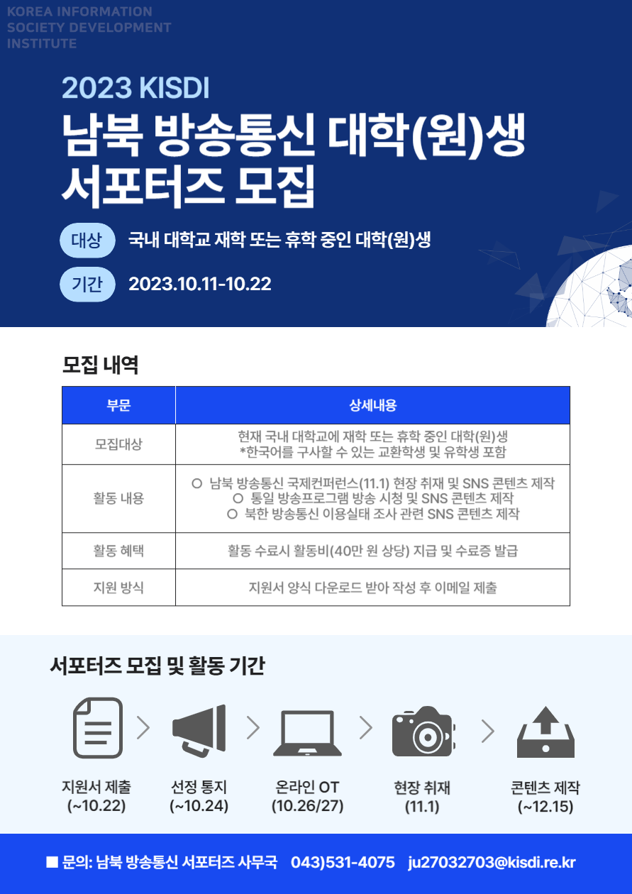 국무조정실 산하 국책연구기관인 정보통신정책연구원(KISDI)에서 <2023 남북 방송통신 대학(원)생 서포터즈>를 모집합니다.