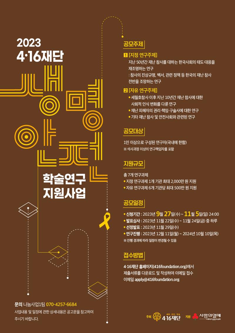 4·16재단은 세월호참사 이후 ‘아이들이 마음껏 꿈꿀 수 있는, 일상이 안전한 사회’를 염원하는 피해자 가족과 시민들의 뜻이 모여 만들어졌습니다. 4·16재단은 2019년부터 <생명안전 학술연구 지원사업>을 통하여 세월호참사 이전과 다른 사회, 생명이 존중되는 일상이 안전한 사회를 만들기 위한 다방면의 연구 활동을 지원하고 있습니다. 이 연구 지원사업을 통해 차세대 연구자를 양성하고 다양한 문제 제기와 대안 제시를 통한 사회 변화의 토대를 마련하고자 하오니, 관심 있는 연구자 여러분의 많은 참여를 바랍니다