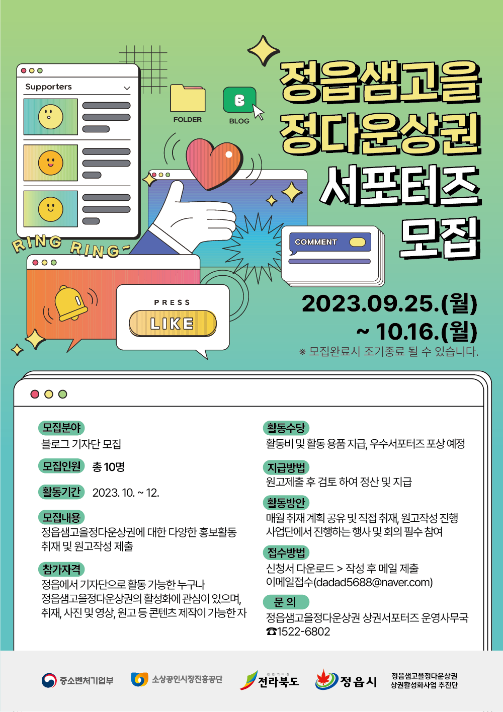 ∙ 정읍샘고을정다운상권 상권서포터즈 운영사무국 ☎ 1522-6802∙ 정읍샘고을정다운상권 상권활성화추진단 ☎ 063-534-3500