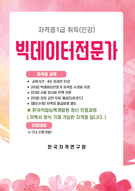 - 빅데이터전문가 인강자격증(300,000원) 무료 제공
