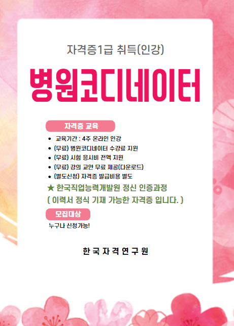 - 병원코디네이터 인강자격증(300,000원) 무료 제공