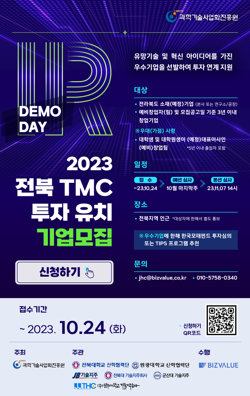 전북대학교 산학협력단이 주관, 전북 TMC(Technology Management Center)사업단에서는 전라북도 소재기업(본사 또는 연구소/공장소재)과 예비창업자, 모집공고일 기준 3년이내 초기 창업 기업을 대상으로 유망기술 및 혁신 아이디어를 가진 우수기업을 선발하여 투자 연계를 지원하고자 「2023년 전북 TMC IR DEMO DAY」를 개최하고자 하니 많은 관심과 참여를 바랍니다.