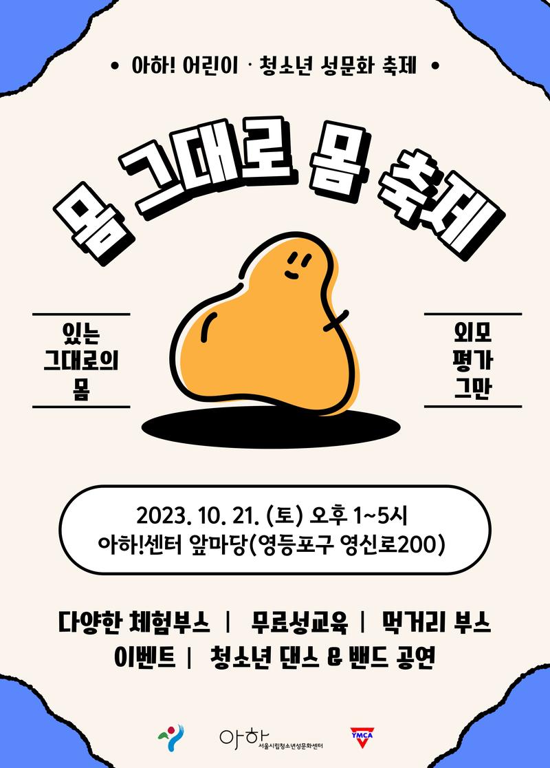 - 주최/주관: 시립아하청소년성문화센터– 일시: 2023.10.21.(토) 오후 1~5시– 장소: 아하!센터 앞마당(영등포구 영신로 200)– 프로그램: 공연, 체험부스, 무료 성교육, 먹거리, 이벤트 등 누구나 자유로운 방문과 참여가 가능한 그 곳 !