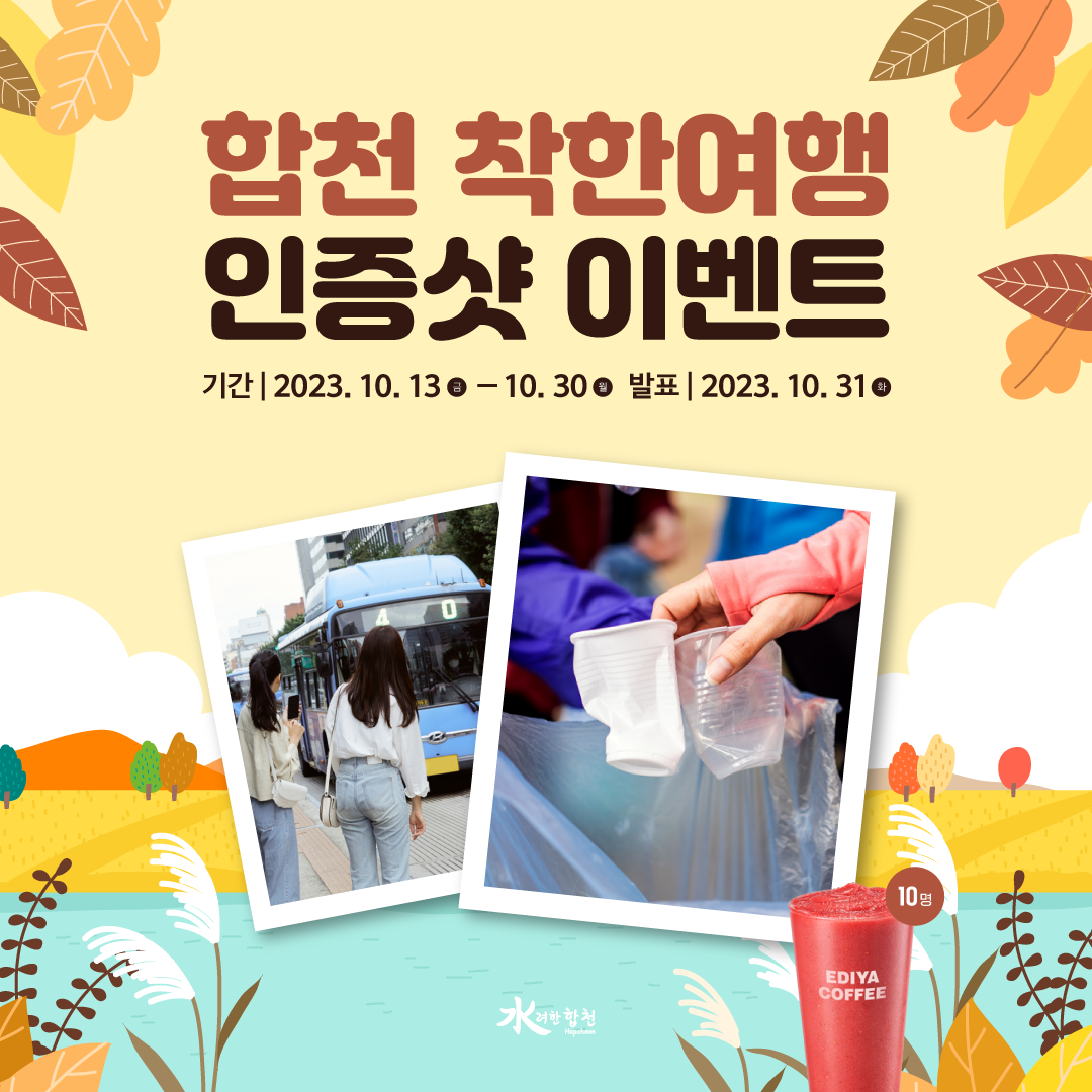합천 여행을 했을 뿐인데 경품이 와르르 🎁😎 여행도 즐기고, 경품도 받는 특별한 이벤트! 여러분의 많은 참여와 관심 부탁드립니다. 🙏 ⠀⠀ 💌 이벤트 기간 : 10월 13일(금) - 30일(월) 💌 당첨자 발표 : 10월 31일(화) 💌 참여방법 💚 STEP1 : 방법① 또는 방법② 중 택1하여 사진 촬영 ▶ 방법① 음식점 방문, 로컬푸드 및 기념품 구입 등의 합천 여행 소비활동 촬영 ▶ 방법② 합천 여행을 하며 실행한 착한 여행 방법 촬영 예시) 관광지 쓰레기 줍기, 쓰레기 되가져가기, 에코백·텀플러 사용 * 합천에 방문했음을 인증하는 사진 업로드만 이벤트 참여로 간주 * 게시물 업로드 시 방문한 합천 여행지, 맛집 등의 명칭 또는 실행한 착한여행 방법 표기 필수 💚 STEP2 : 필수 해시태그와 함께 개인 인스타그램 또는 페이스북 업로드 ▶필수 해시태그 : #합천_ESG #합천착한여행 #10월_합천착한여행챌린지 ⠀⠀ 💌 이벤트 경품 : 이디야커피 딸기주스R(10명) * 본 이벤트는 월마다 진행됩니다.(6월-11월) * 연간 총괄 우수 참여자를 선정하여 경품 지급합니다.(12월) - 대상 : 다이슨 에어랩(1명) - 금상 : 태블릿 PC(2명) - 은상 : 글램핑숙박권(5명) - 동상 : 관광굿즈 또는 합천특산물(10명) |