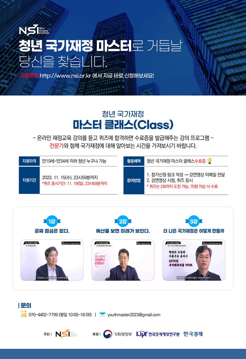 청년 국가재정 마스터 클래스는 온라인 재정교육 강의를 듣고 퀴즈에 합격하면 수료증을 발급해주는 강의 프로그램입니다. 전문가와 함께 국가재정에 대해 알아보는 시간을 가져보시기 바랍니다.