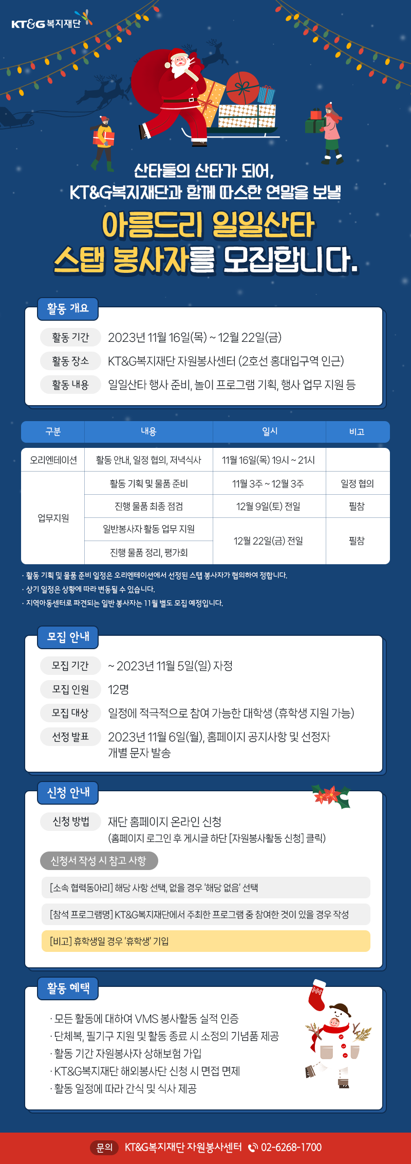 KT&G복지재단에서는 산타들의 산타가 되어 줄 2023년 아름드리 일일산타 스탭 봉사자를 모집합니다.