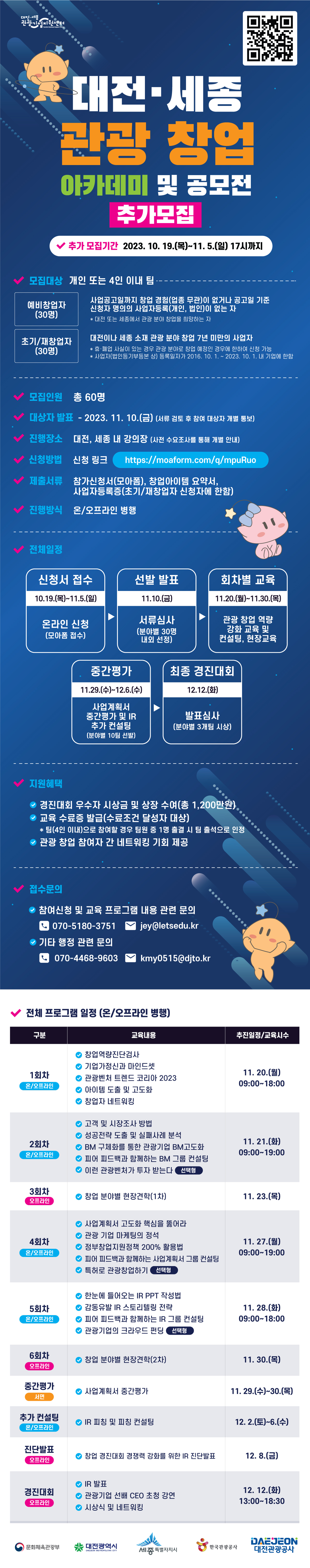 - 모집 대상 : 대전·세종 관광 분야 예비 창업자, 초기/재창업자(7년 미만) 개인 또는 4명 이내 팀