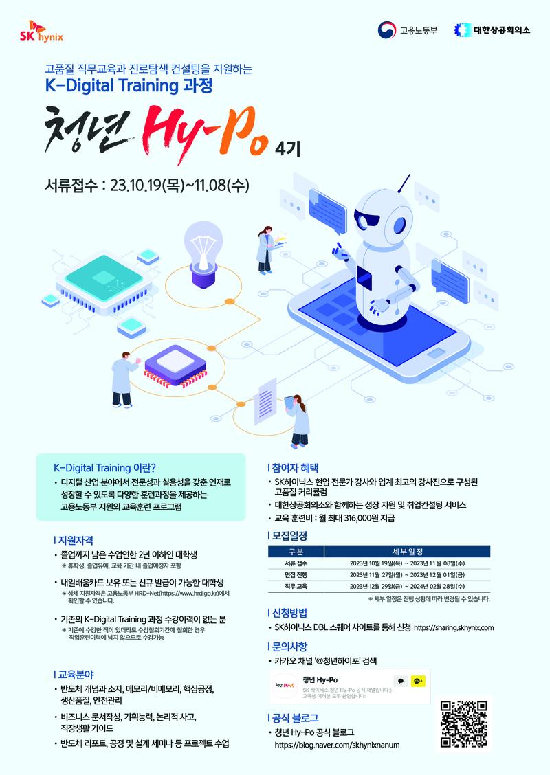 청년 Hy-Po는 SK하이닉스와 고용노동부와 함께하는 K-Digital Training 과정으로 고품질 반도체 직무교육과 진로탐색 컨설팅을 지원하는 프로그램입니다. 청년 Hy-Po는 반도체 산업 근무에 필요한 필수 직무역량을 강화하고 전문성과 실용성을 갖춘 인재로 성장할 수 있도록 반도체 기초·전문교육을 제공합니다.