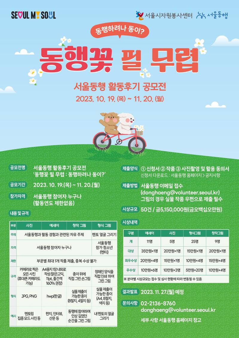 - 모든 응모작품의 권한은 주최 기관에 귀속되며, 공모전의 취지와 목적 달성을 위해 향후 가공·변형하여 서울동행 관련 홍보자료로 활용될 수 있습니다.