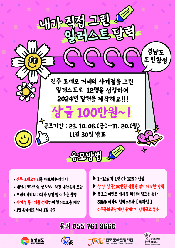 재)진주문화관광재단에서는 청년 문화의 거리 홍보 및 경남도민의 예술성 고취를 위하여 제작하는 「2024년 디지털 달력」 에 삽입될 일러스트 제작 참가자를 모집하고자 하오니 많은 관심과 신청 부탁드립니다.
