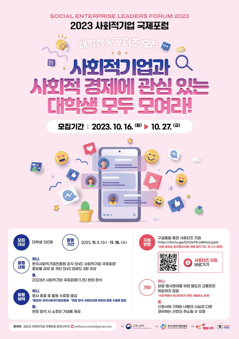 지속 가능한 사회적경제의 발전 방안을 모색하기 위해 고용노동부와 한국사회적기업진흥원은 2012년부터 매년 사회적기업 국제포럼을 주최ᐧ주관해오고 있습니다. 이에 한국사회적기업진흥원은 사회적기업의 발전에 대한 대국민 공감대 확산을 위해 함께 할 대학생 서포터즈를 모집하니