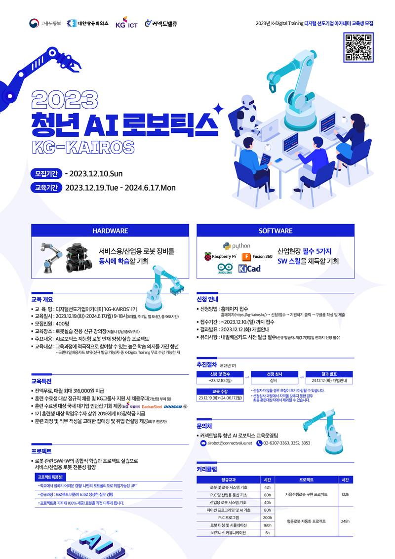 - 로봇 실습 장비(Robot Arm, TutleBot 등), 노트북 지원, 매월 훈련장려금 최대 316,000원 및 KG그룹 장학금 지원