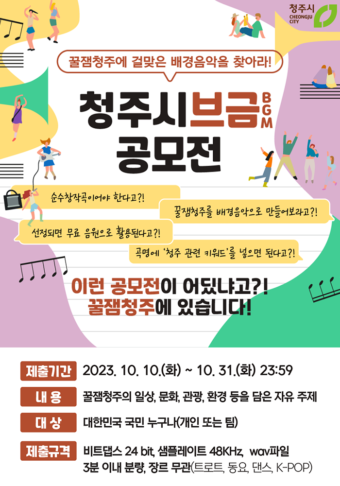 청주시는 꿀잼청주의 이미지를 창작 배경음악에 담아 널리 홍보하고자 ‘꿀잼청주 배경음악(BGM) 공모전’을 개최합니다. 수상작은 창작자, 누리소통망(SNS) 이용자들이 활용할 수 있도록 무료 음원으로 배포할 계획입니다. 독창적인 음악으로 ‘청주’라는 도시의 매력을 표현하는 ‘꿀잼청주 배경음악(BGM) 공모전’에 여러분의 많은 관심과 참여 바랍니다.