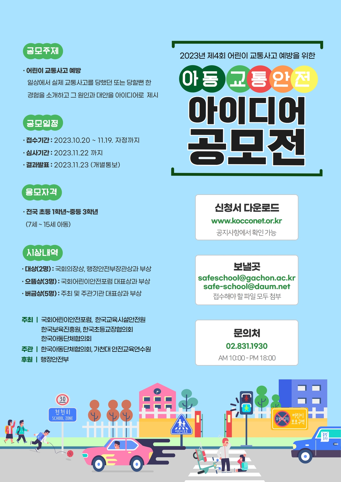 ○ 접수방법 : 한국아동단체협의회 홈페이지 ▶ 공지사항 ▶「제4회 아동 교통안전 아이디어 공모전」서식 다운 ▶ 공모전 이메일 접수