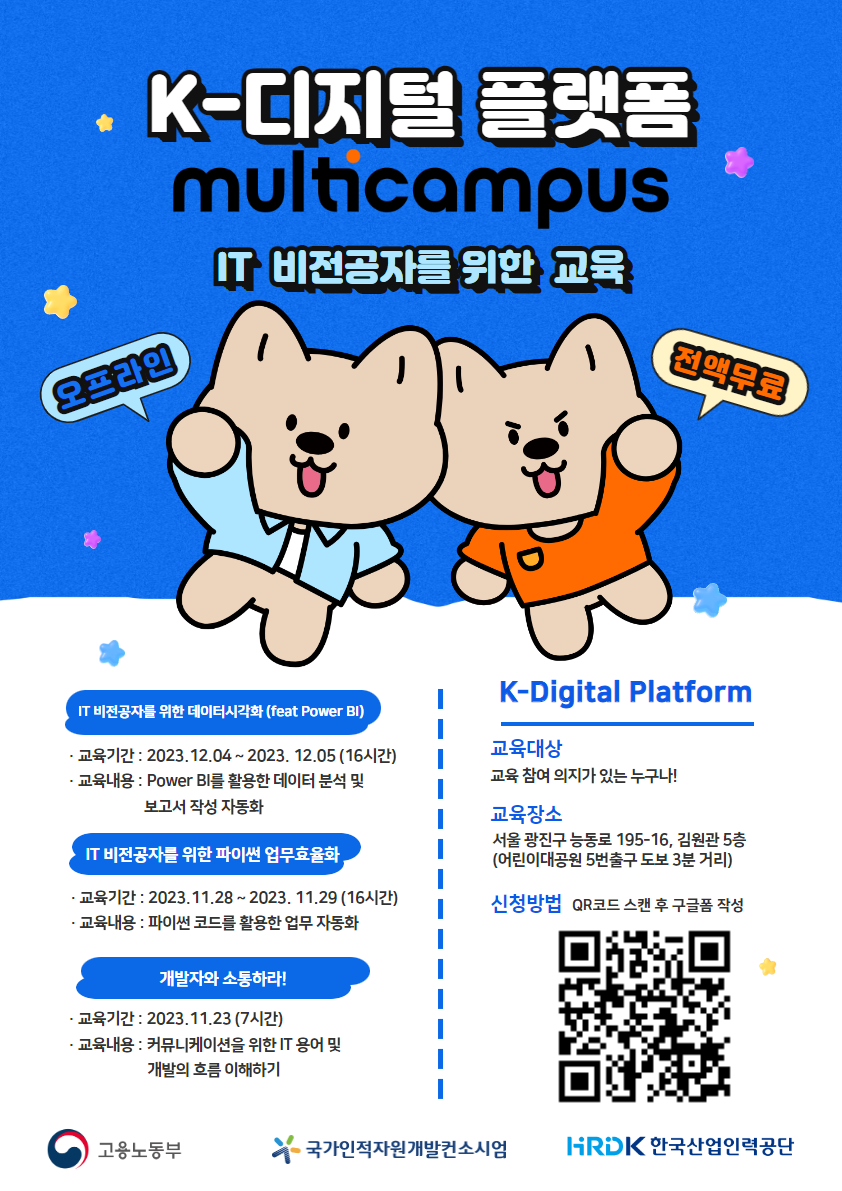 디지털 리터러시를 제공하고 누구나 경험하고 성장할 수 있도록 ‘K-디지털 플랫폼’과 함께 하고 있습니다.