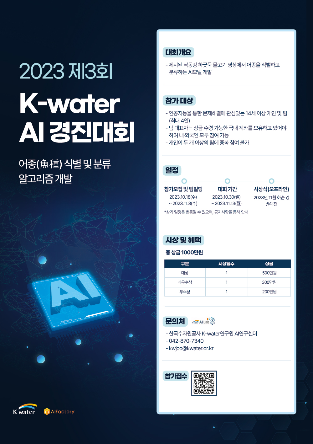 - 주최 기관 담당자 : [한국수자원공사] K-water연구원 AI연구센터, kwjoo@kwater.or.kr