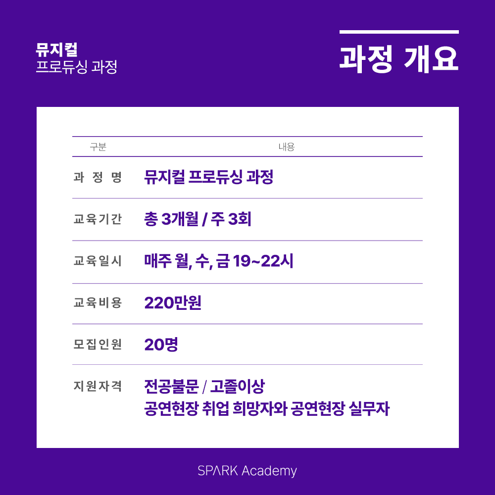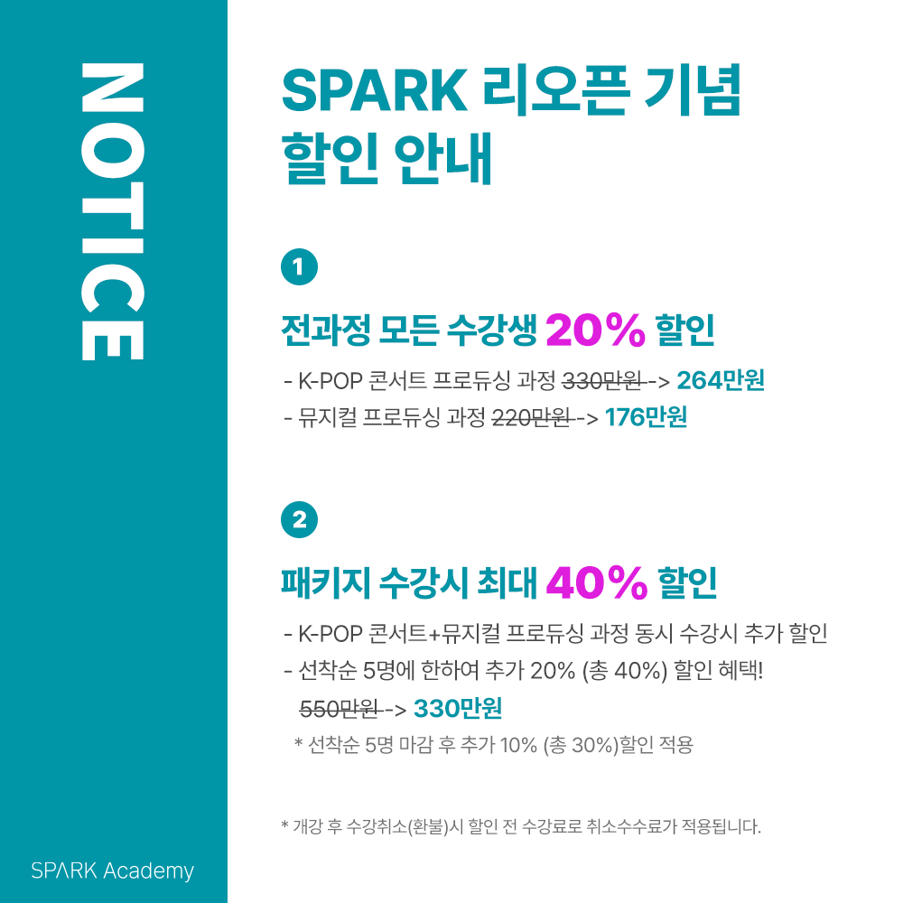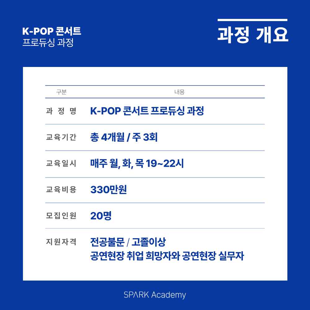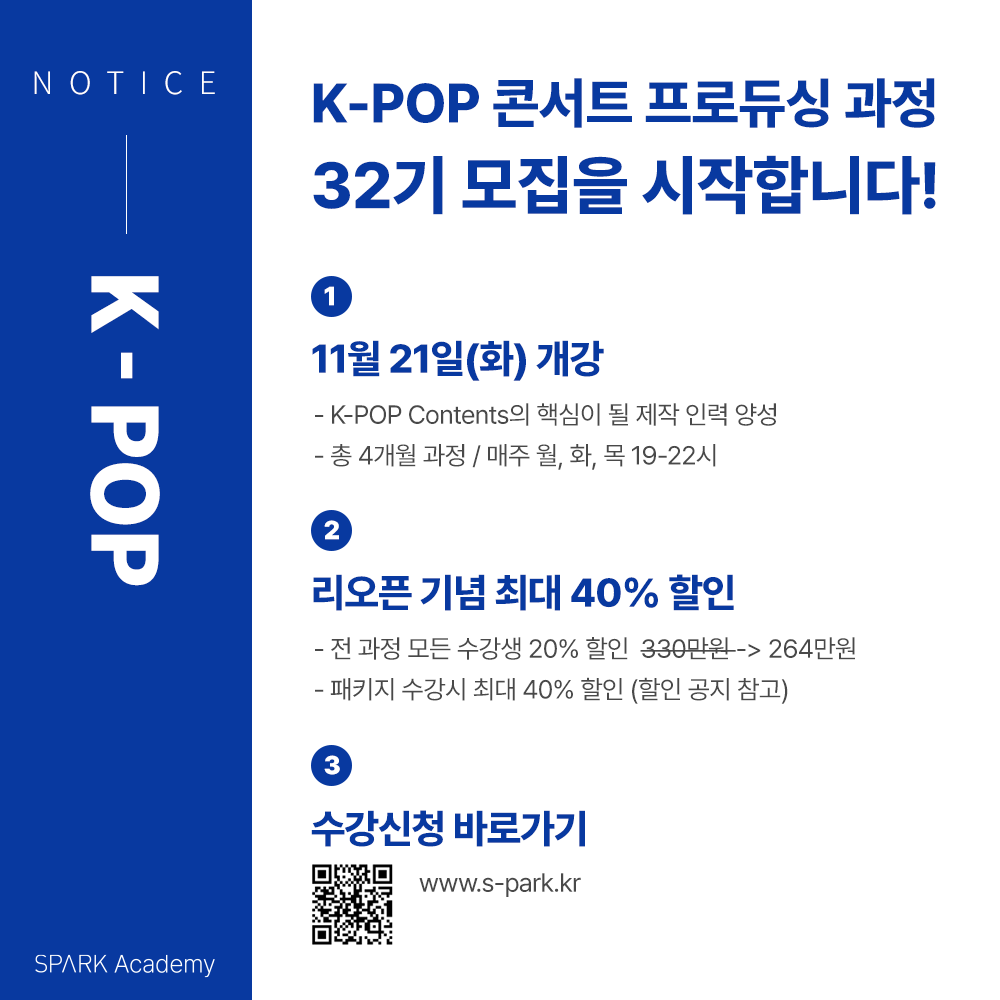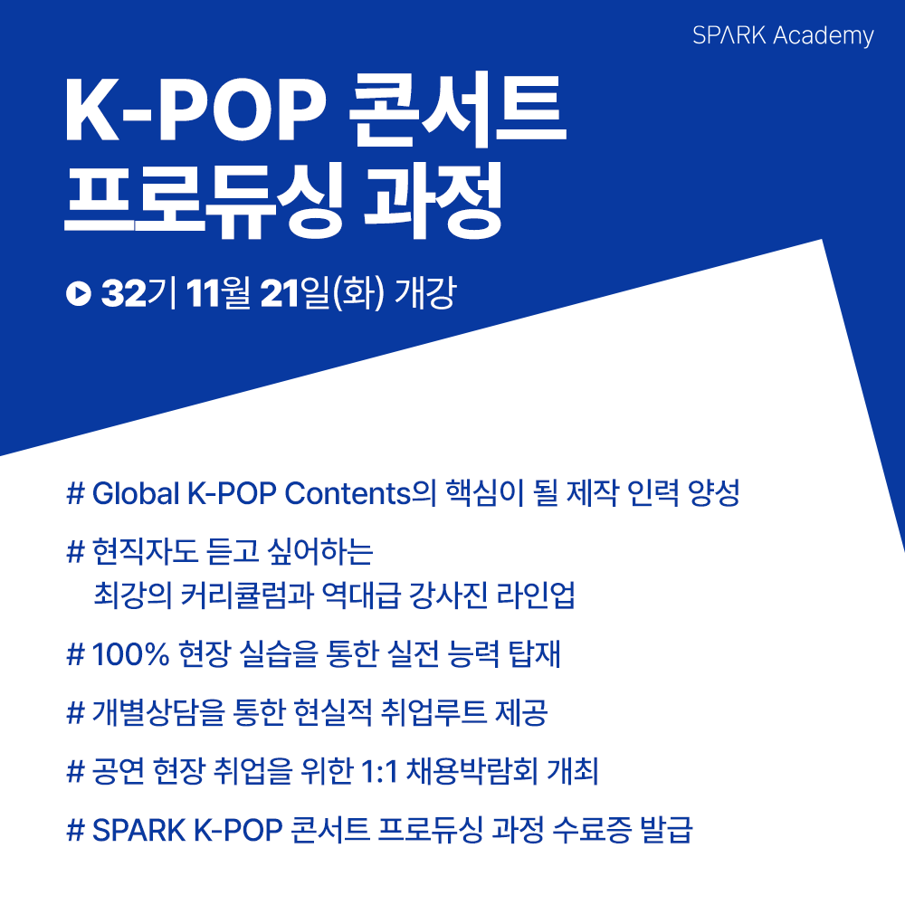 SPARK Academy의 [K-POP 콘서트 프로듀싱]과 [뮤지컬 프로듀싱 과정] 32기 모집이 드디어 시작했습니다~!