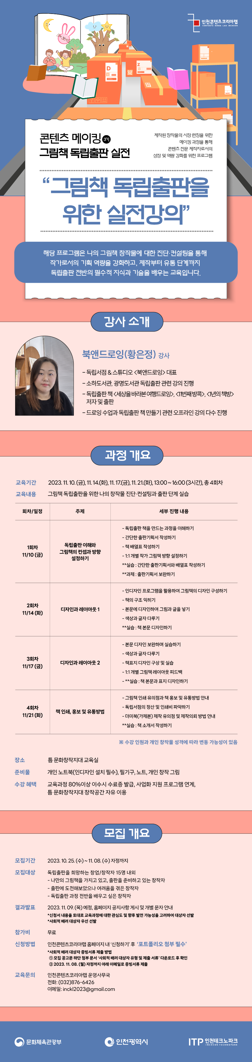 ▶ 교육문의: 인천콘텐츠코리아랩 운영사무국 032-876-6426 / 010-9094-5670 inckl2023@gmail.com