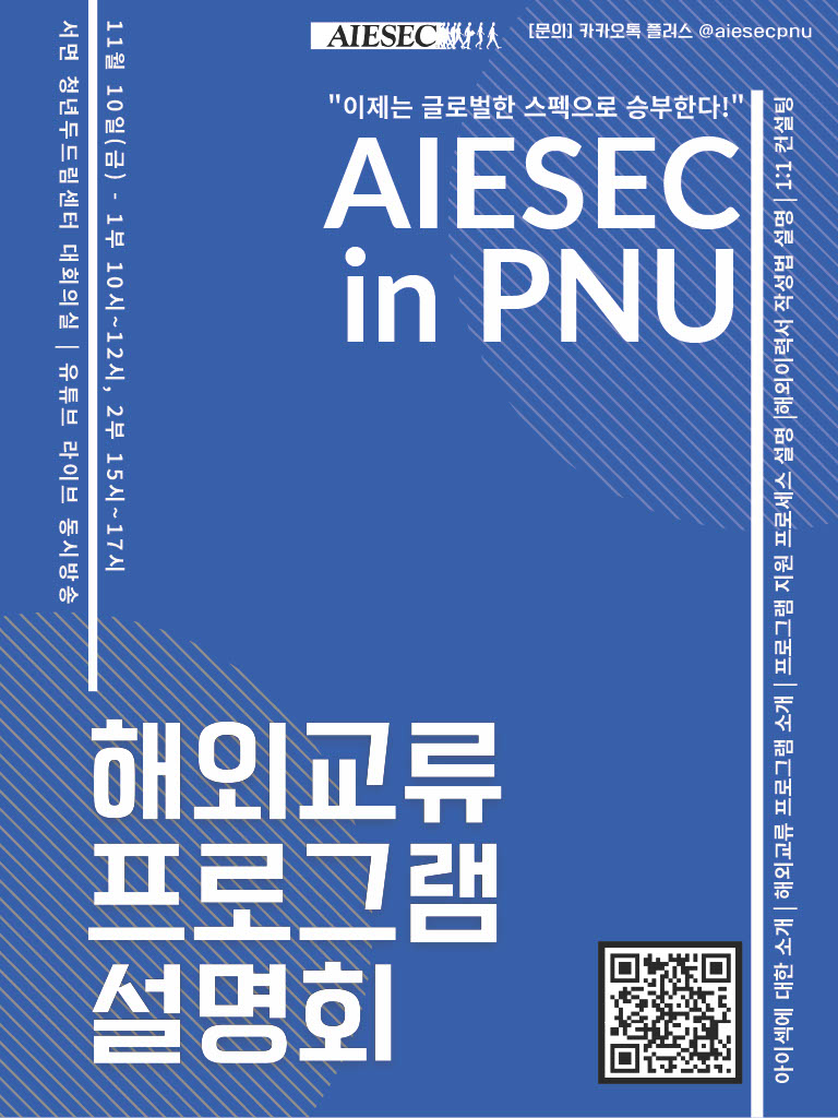 자세한 정보는 네이버 블로그 AIESEC in PNU 또는 카카오톡채널 @aiesecpnu를 방문해주세요!