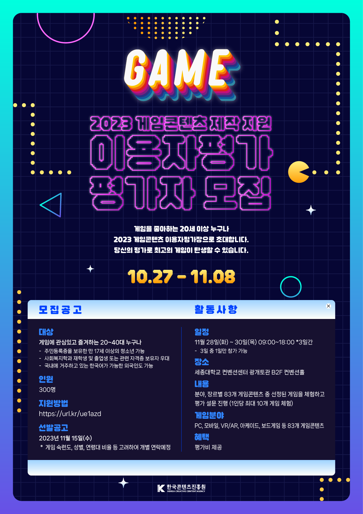 선발공고: 2023년 11월 15일 (수) /게임 숙련도, 성별, 연령대 비율 등 고려하여 개별 연락예정