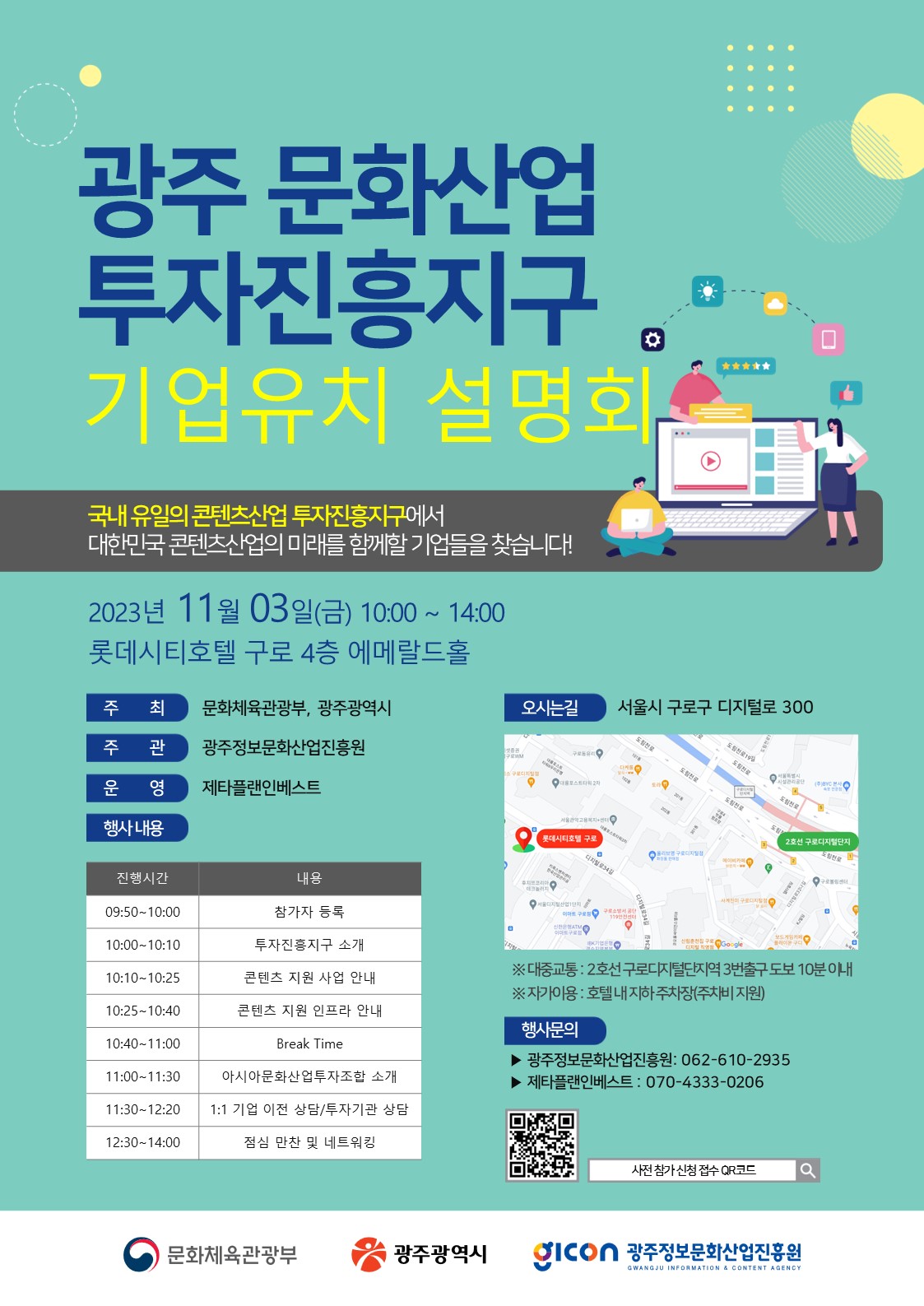동 사는 국내 유일의 콘텐츠 산업 투자 진흥기구인 광주문화산업 투자진흥지구의 기업유치 설명회의 안내를 하고자 합니다.