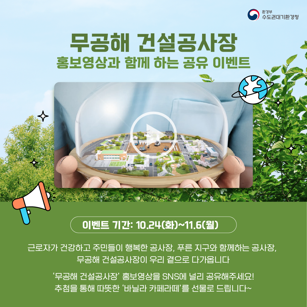 무공해 건설공사장 홍보 영상을 SNS에 공유하고 따듯한 바닐라 라떼 받아가세요~
