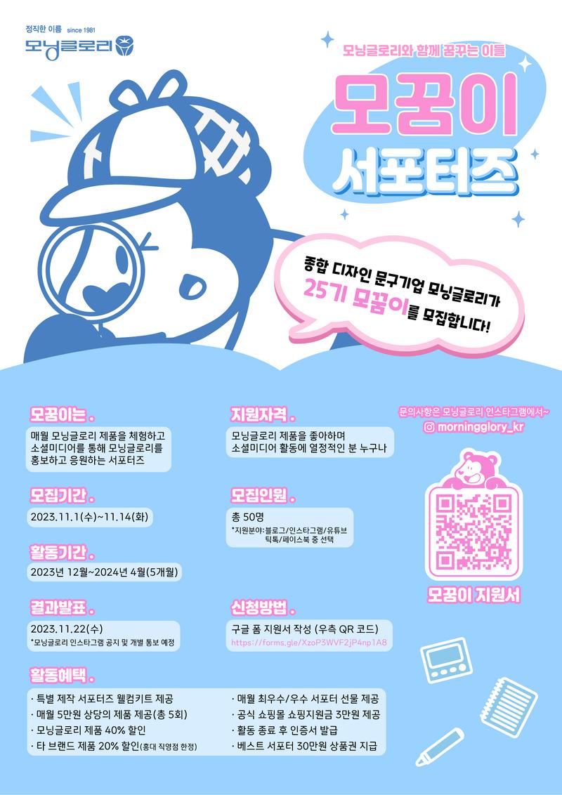 종합 디자인 문구기업 모닝글로리가 모꿈이 서포터즈를 모집합니다🫶