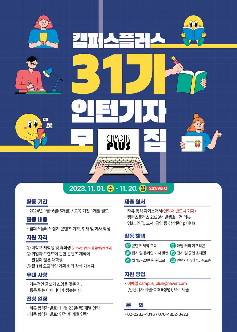 2006년 3월 창간한 대학 문화 매거진 《캠퍼스플러스》에서 31기 인턴기자를 모집합니다.
