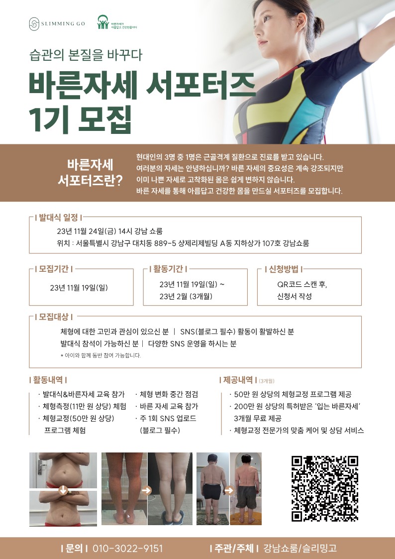 현대인의 3명 중 1명은 근골격계 질환으로 진료를 받고 있습니다. 여러분의 자세는 안녕하십니까? 바른 자세의 중요성은 계속 강조되지만 이미 나쁜 자세로 고착화된 몸은 쉽게 변하지 않습니다. 바른 자세를 통해 아름답고 건강한 몸을 만드실 서포터즈를 모집합니다.