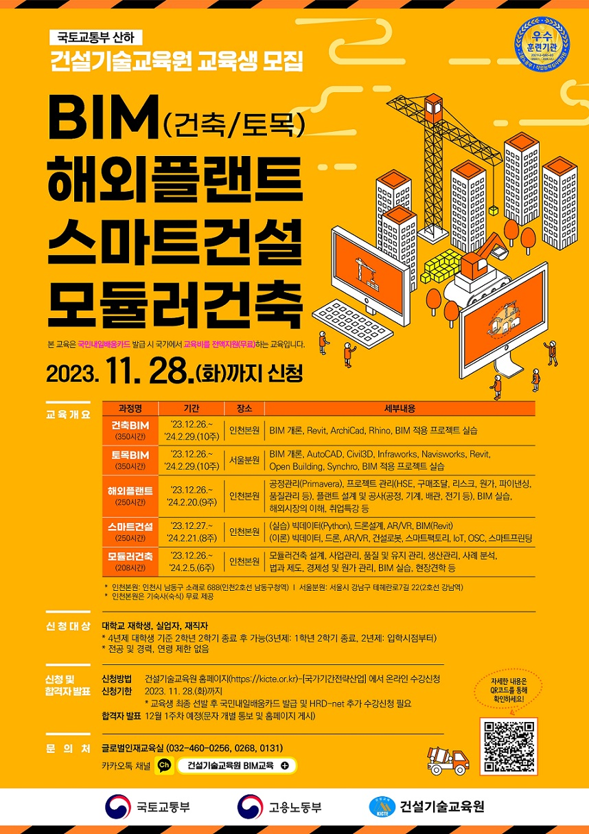 BIM, 플랜트, 스마트건설, 모듈러건축 교육생을 모집합니다.
