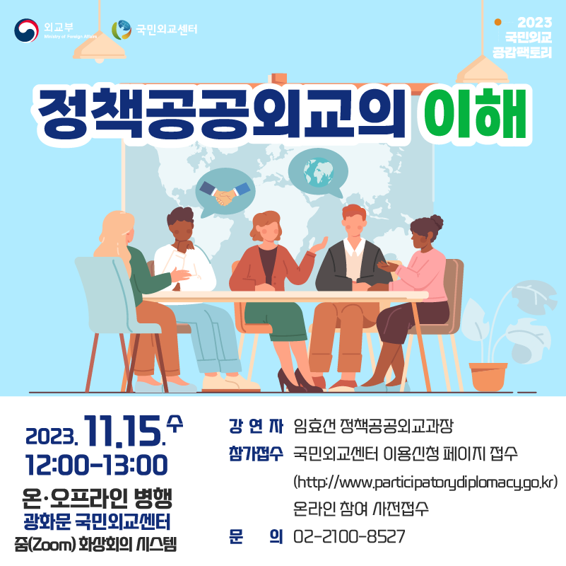 외교부는 11월 15일(수) 12:00-13:00 “정책공공외교의 이해"를 주제로 국민외교 공감팩토리를 개최할 예정입니다.