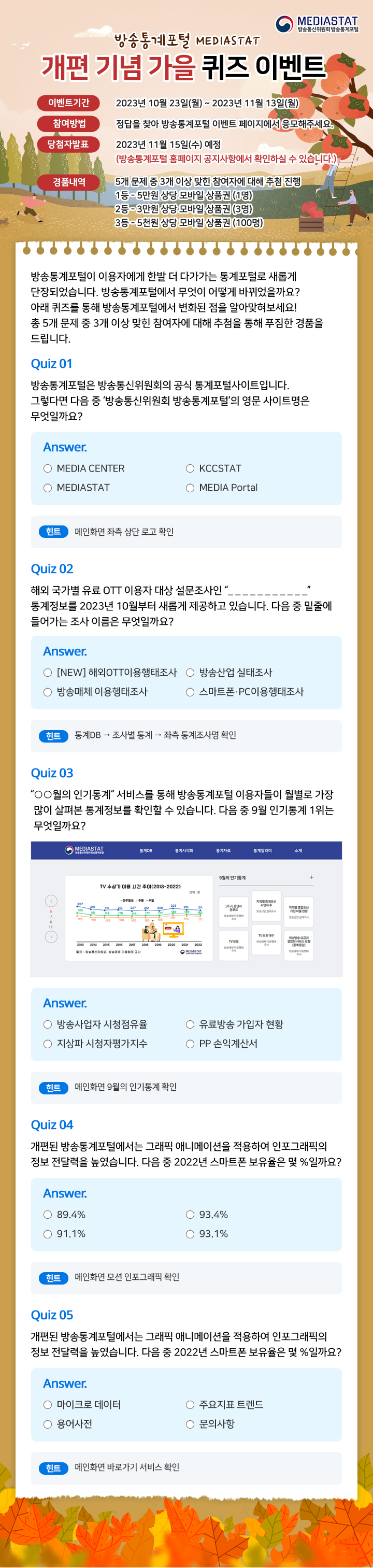 📢 정보통신정책연구원 방송통계포털이 새롭게 개편되었습니다! 홈페이지 리뉴얼 기념으로 누구나 쉽게 참여 가능한 퀴즈 이벤트를 진행하게 되어 알려드리고자 합니다. (총 100명에게 상품 지급 예정입니다!)