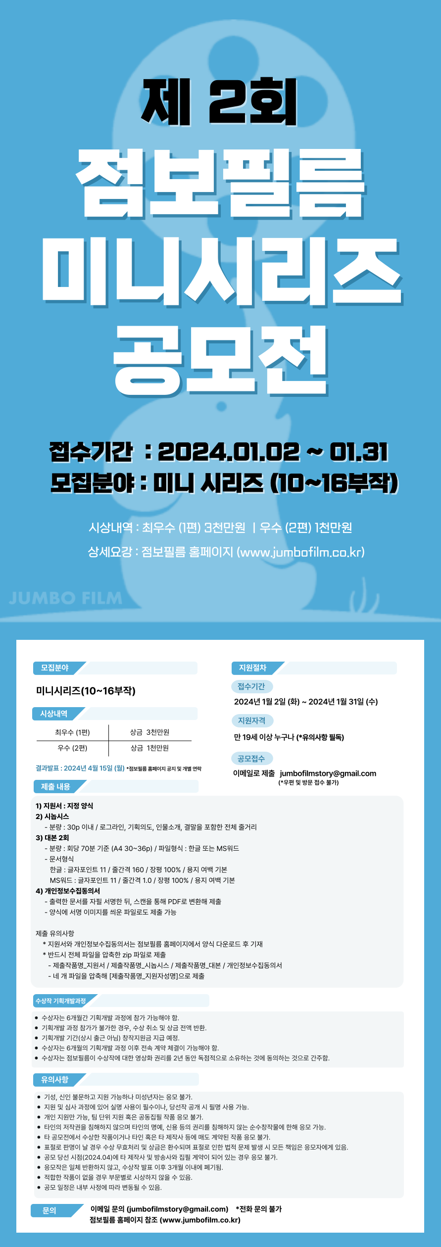 결과발표: 2024년 4월 15일(월) * 점보필름 홈페이지 공지 및 개별 연락