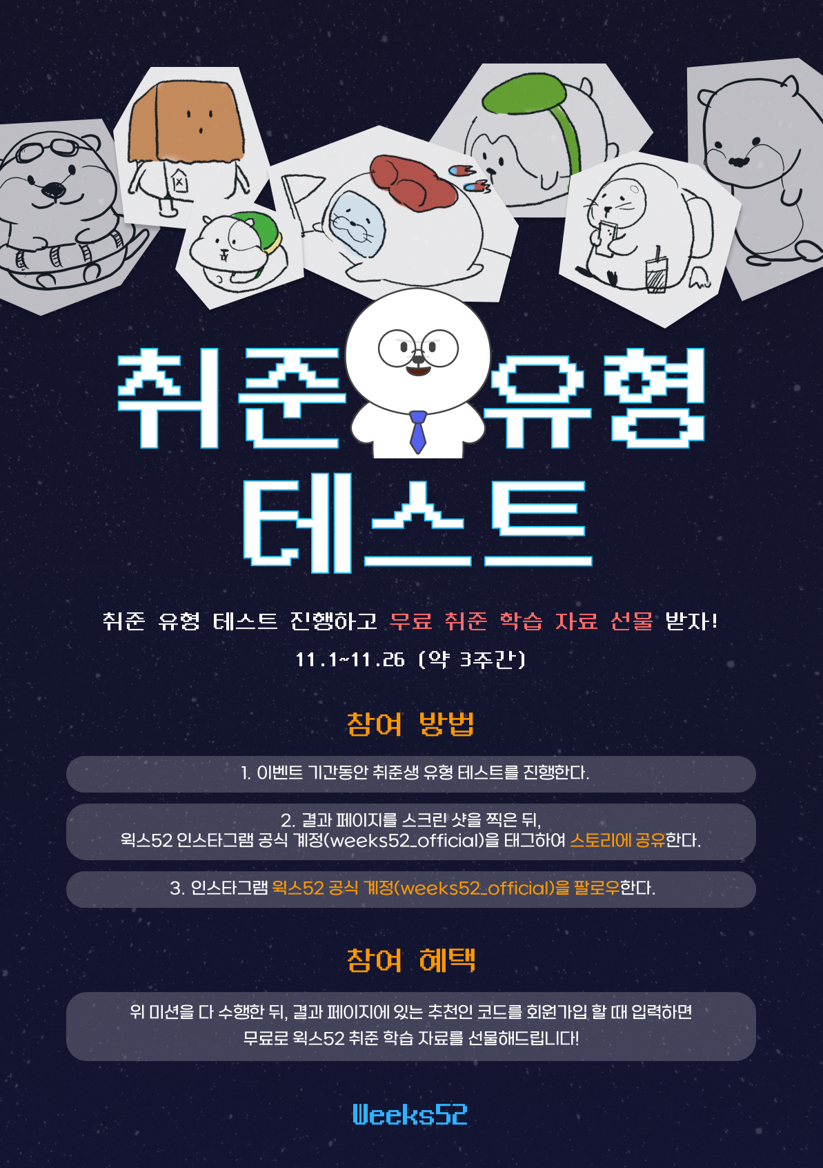 1. ์ด๋ฒคํธ ๊ธฐ๊ฐ(11.1~11.26)๋์ ์ทจ์ค์ ์ ํ ํ ์คํธ๋ฅผ ์งํํ๋ค.