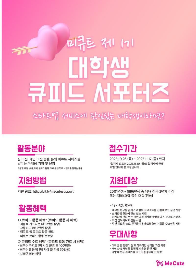 남녀의 설레는 만남을 위한 데이팅 앱 미큐트(MeCute)를 널리 이롭게 알릴 마케팅 연구소 <미큐트(LAB)>의 큐피드를 찾습니다!
