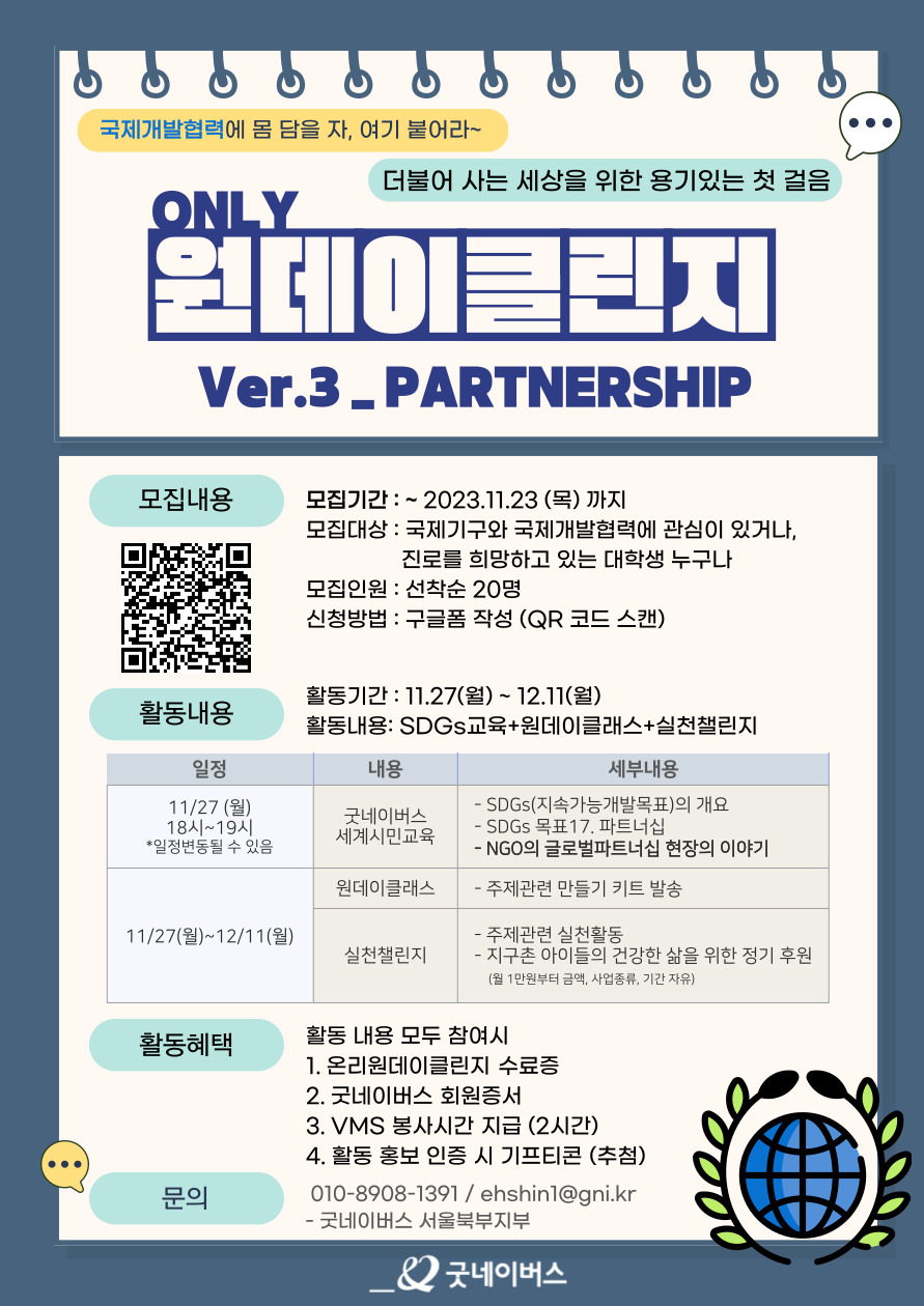 🌍 국제개발협력에 몸 담을 자! 주목!! ‘온리원데이클린지 ver3. 파트너쉽’ 에 함께할 챌린저를 모집합니다🌍