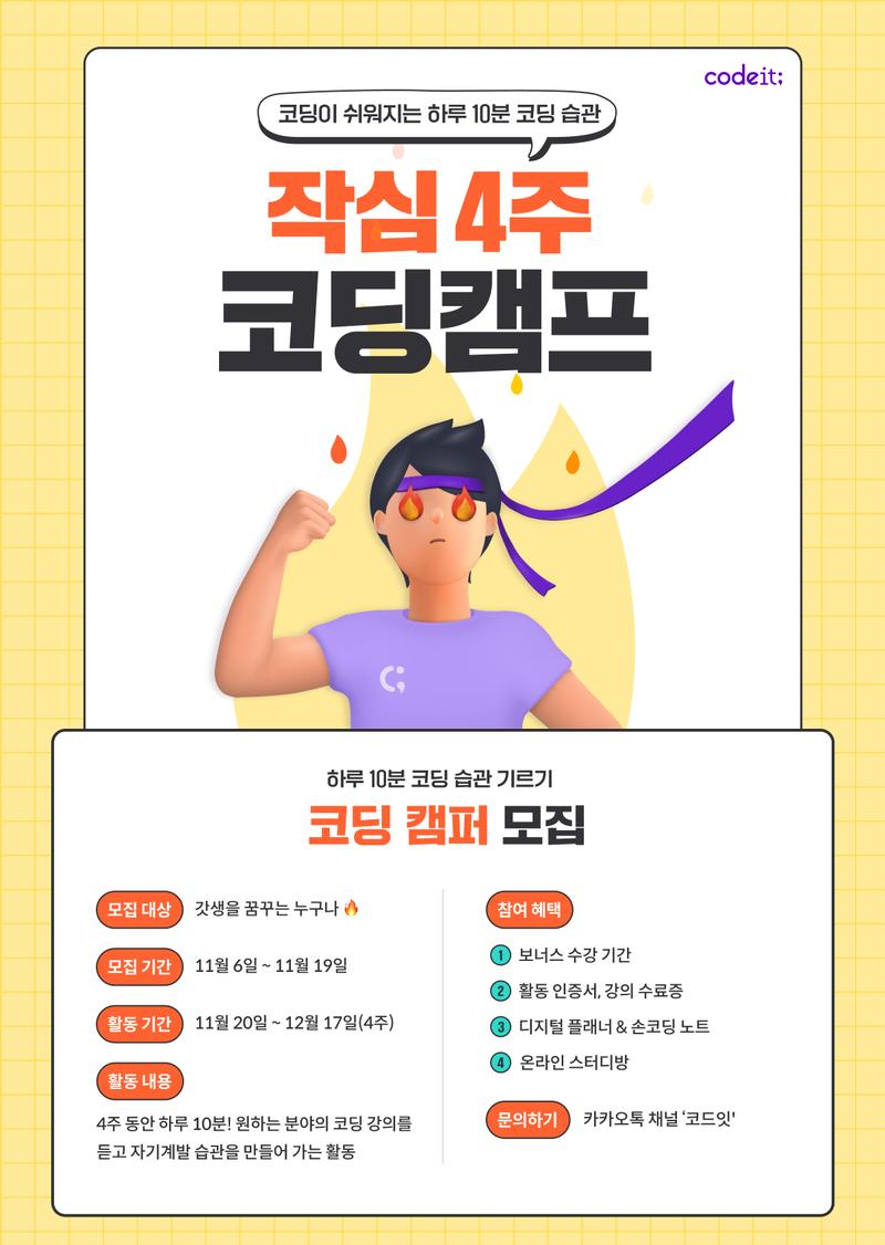 코드잇과 작심 4주 코딩캠프에서 함께 코딩 공부하며 자기계발과 대외활동 두 마리 토끼를 잡아보세요!