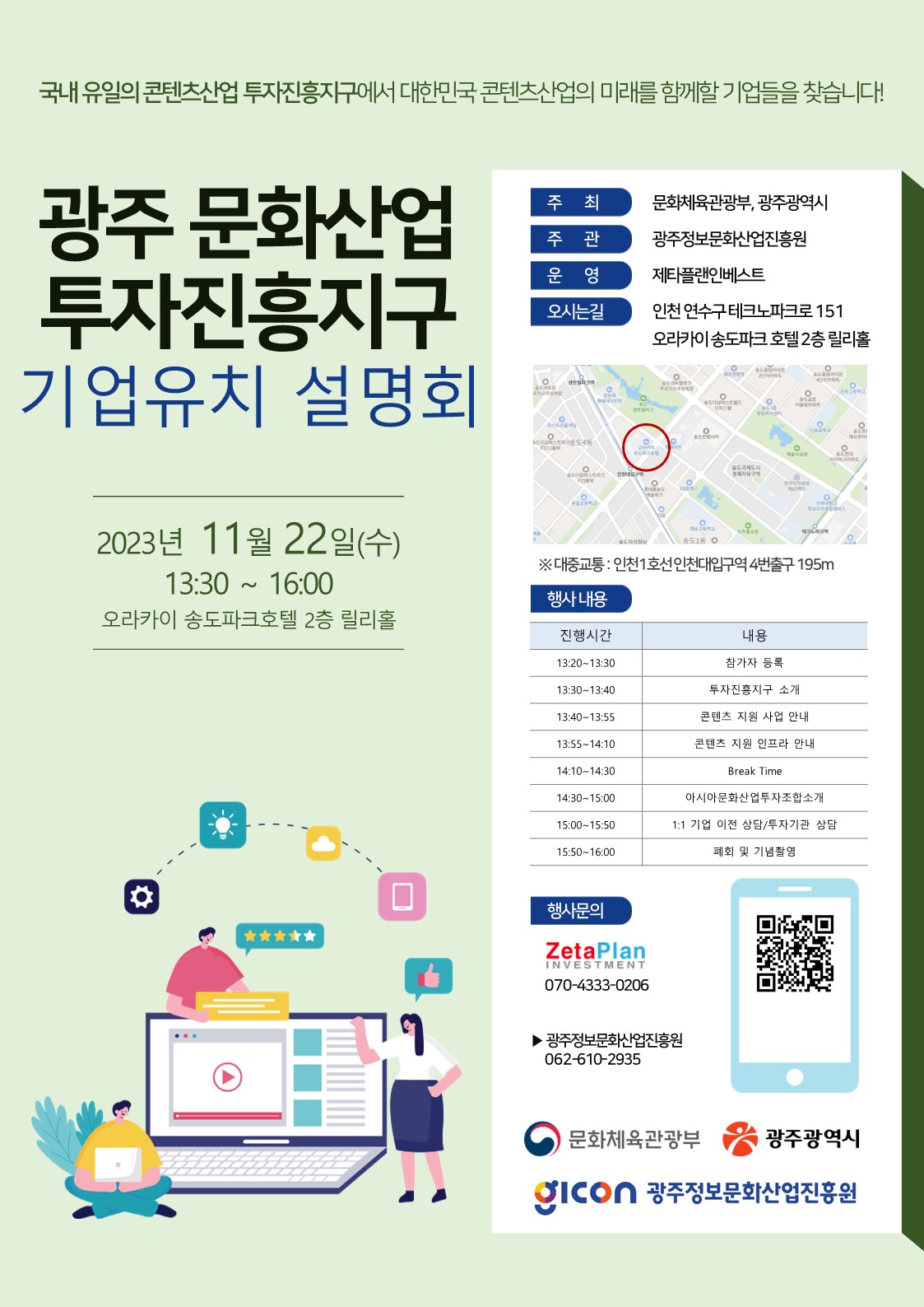 동 사는 국내 유일의 콘텐츠 산업 투자 진흥기구인 광주문화산업 투자진흥지구의 기업유치 설명회의 안내를 하고자 합니다.